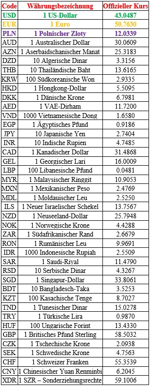 Währungskurse für Kartentransaktionen mit Stand vom 6. Februar