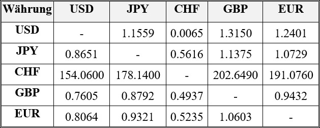 USD – US-Dollar, JPY – Japanischer Yen, CHF – Schweizer Franken, GBP –Pfund Sterling, EUR – Euro