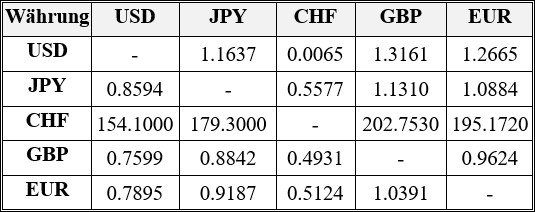 USD – US-Dollar, JPY – Japanischer Yen, CHF – Schweizer Franken, GBP –Pfund Sterling, EUR – Euro