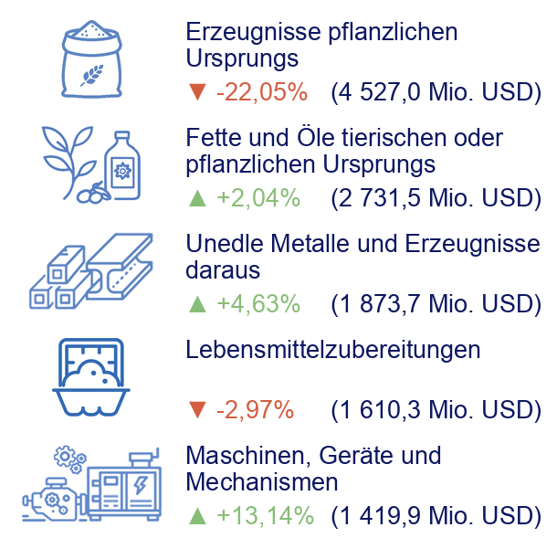 Dynamik der ausfuhr von waren im januar bis mai 2025 nach den wichtigsten artikeln im vergleich zum selben zeitraum 2024, %