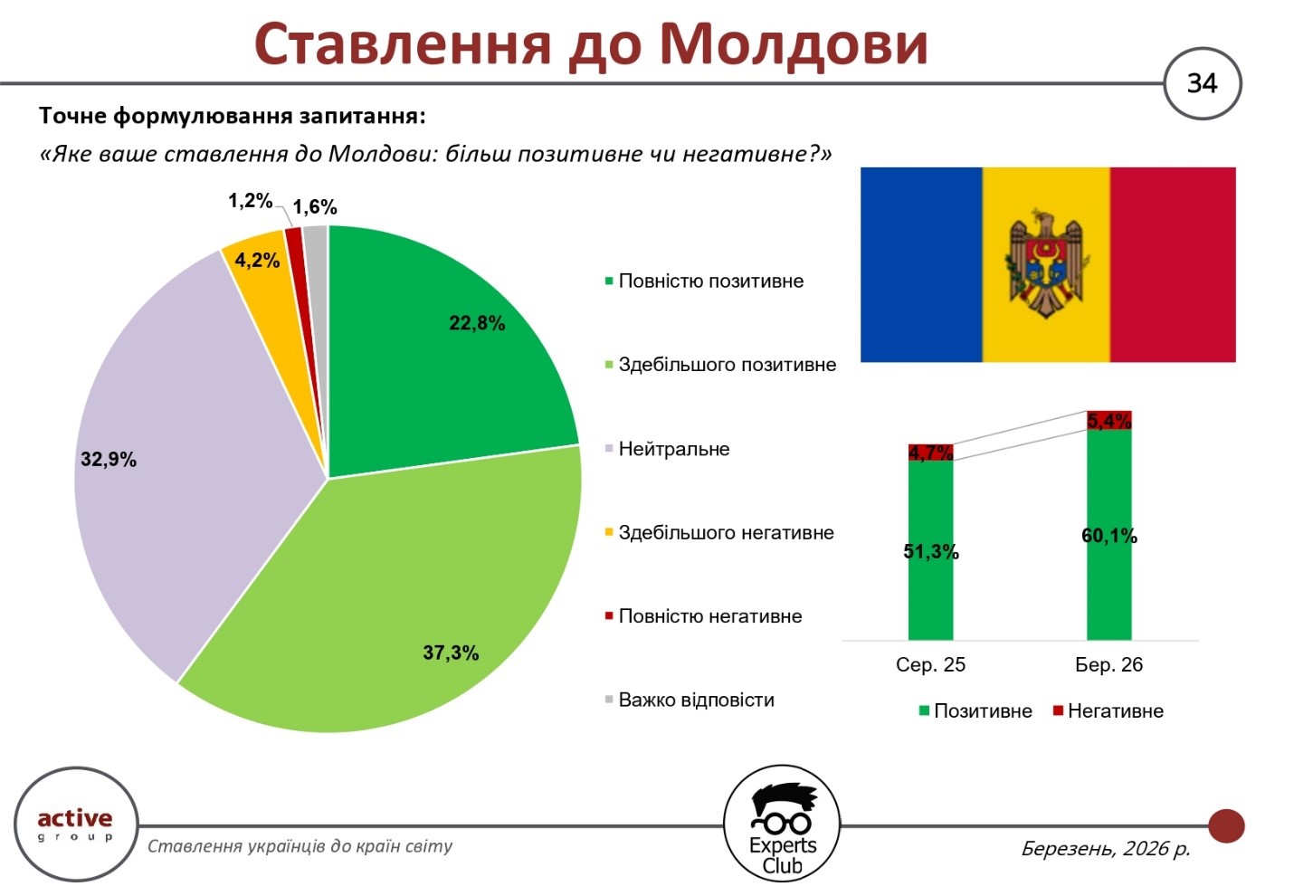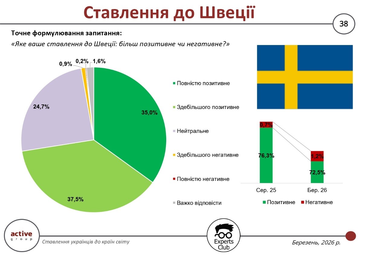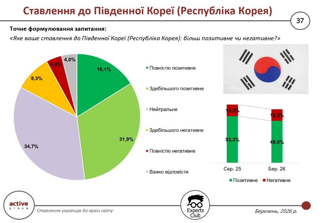 Die Ergebnisse einer im März 2026 vom Marktforschungsunternehmen Active Group gemeinsam mit dem Informations- und Analysezentrum Experts Club durchgeführten Umfrage zeigen eine deutliche Verschlechterung der Einstellung der Ukrainer gegenüber Israel. Der Anteil positiver Bewertungen sank von 44,7 % im August 2025 auf 38,7 %, während die negative Einstellung von 13,7 % auf 19,8 % stieg.