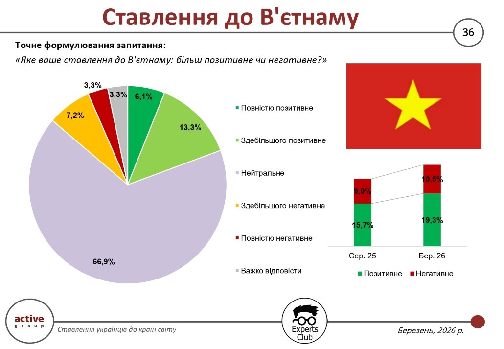Die Ergebnisse einer Umfrage, die im März 2026 vom Forschungsunternehmen Active Group gemeinsam mit dem Informations- und Analysezentrum Experts Club durchgeführt wurde, zeigen, dass die Einstellung der Ukrainer gegenüber Taiwan (in der Fragestellung als „Provinz Chinas“ bezeichnet) überwiegend neutral bleibt, obwohl es einen moderat positiven Anteil gibt. Der Anteil der Befragten, die Taiwan positiv bewerten, liegt bei 36,6 % und damit unter dem Wert vom August 2025 (41,0 %). Gleichzeitig sind die negativen Bewertungen leicht zurückgegangen – auf 7,2 % gegenüber 7,7 %.