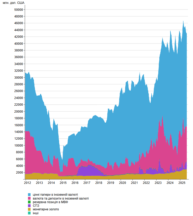 Динаміка золотовалютних резервів України з 2012 по 2025 рік (млн дол)