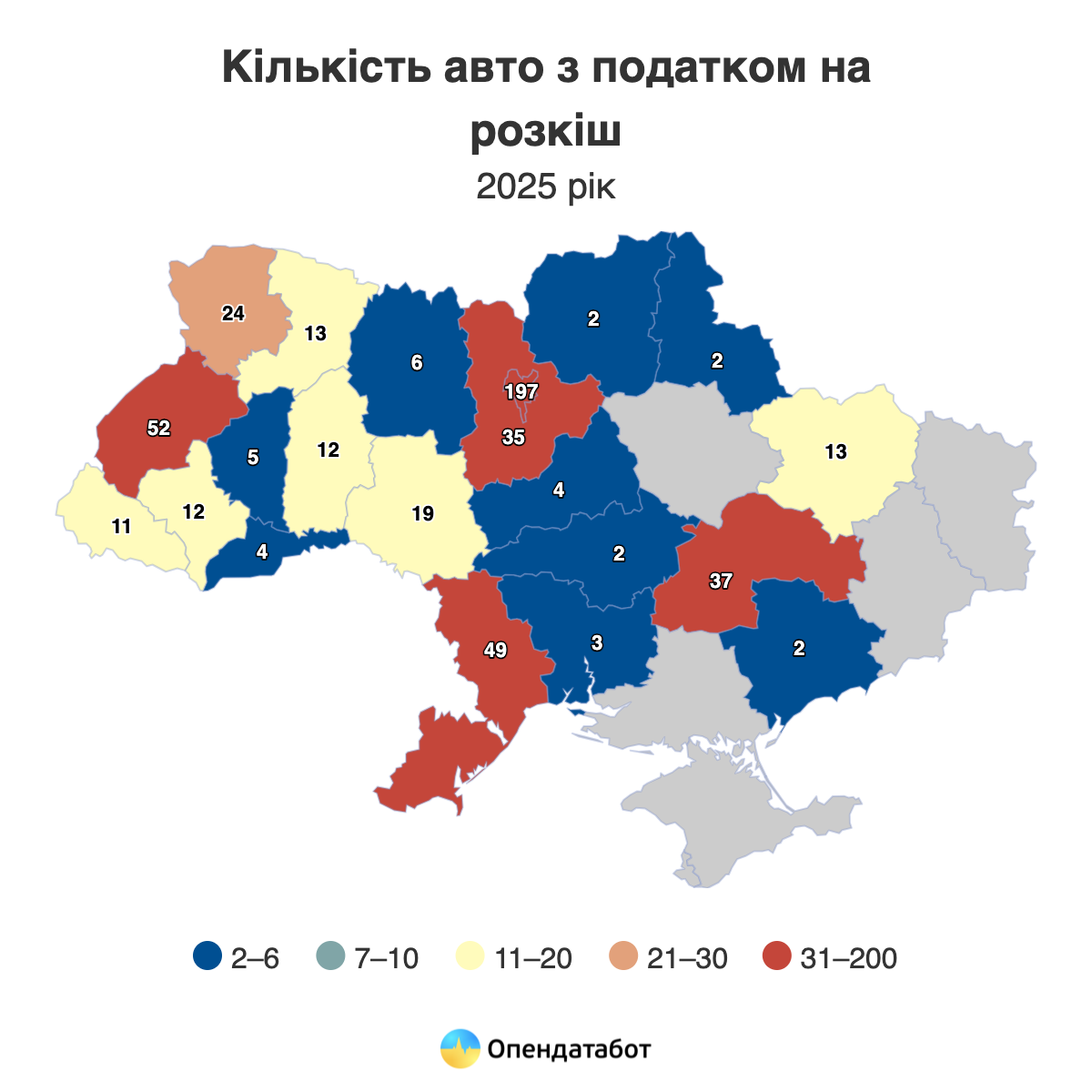 Almost half of all luxury cars are registered in Kyiv and the surrounding region: 236 cars. Another 52 cars are in Lviv region, 49 in Odesa region, and 37 in Dnipropetrovsk region.
