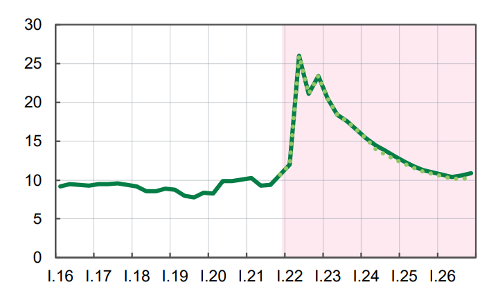 Forecast of dynamics of changes in Ukrainian GDP in % for 2022-2025 in relation to previous period