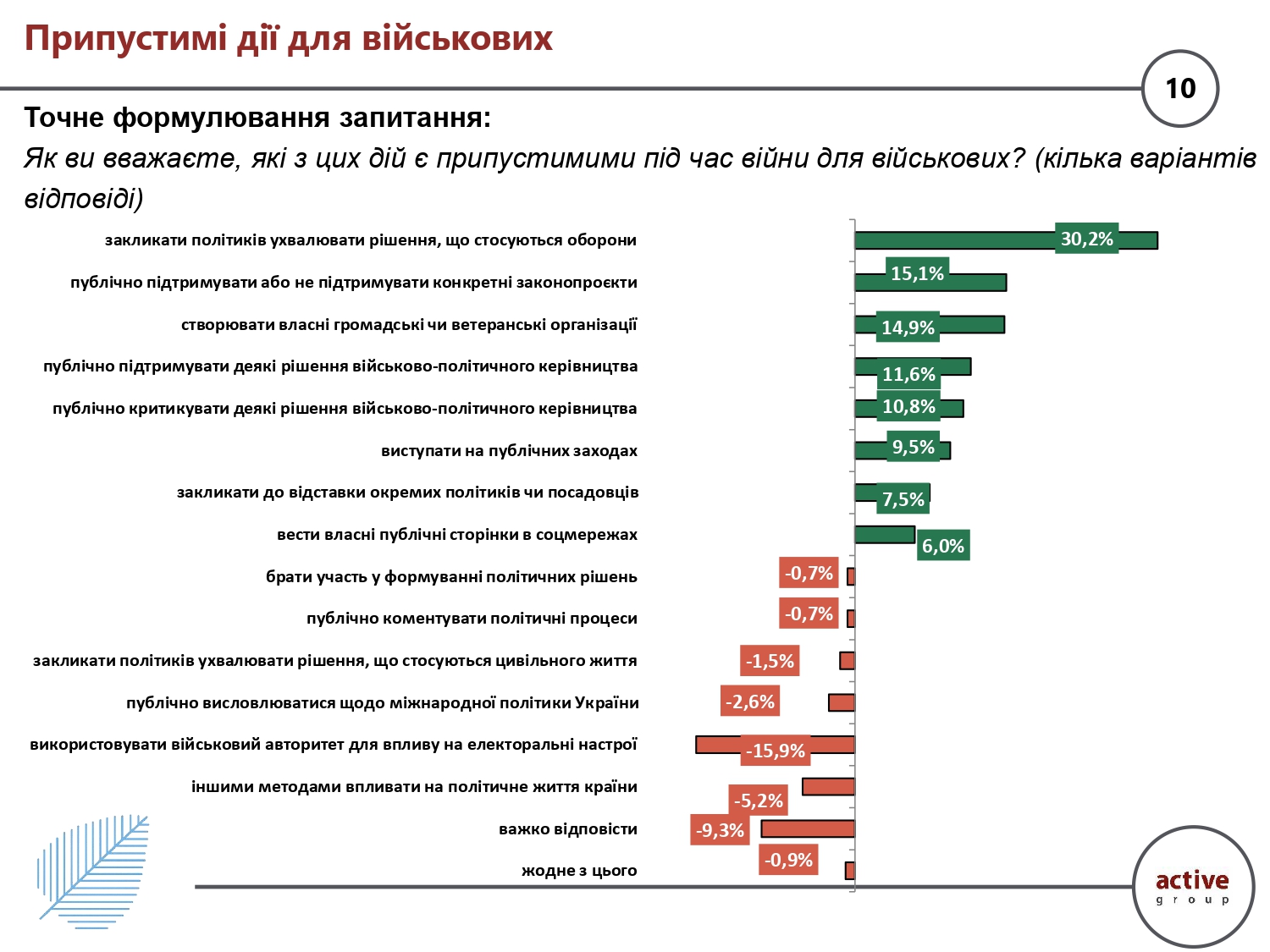 According to the data presented, the actions by the military that received the most support among acceptable activities were calls for politicians to make decisions in the field of defense (30.2%), publicly expressing a position on draft legislation (15.1%), and establishing veterans’ and civic organizations (14.9%). At the same time, the use of military authority to influence electoral sentiment has the lowest rating—a balance of minus 15.9%, which is the worst result among all options.