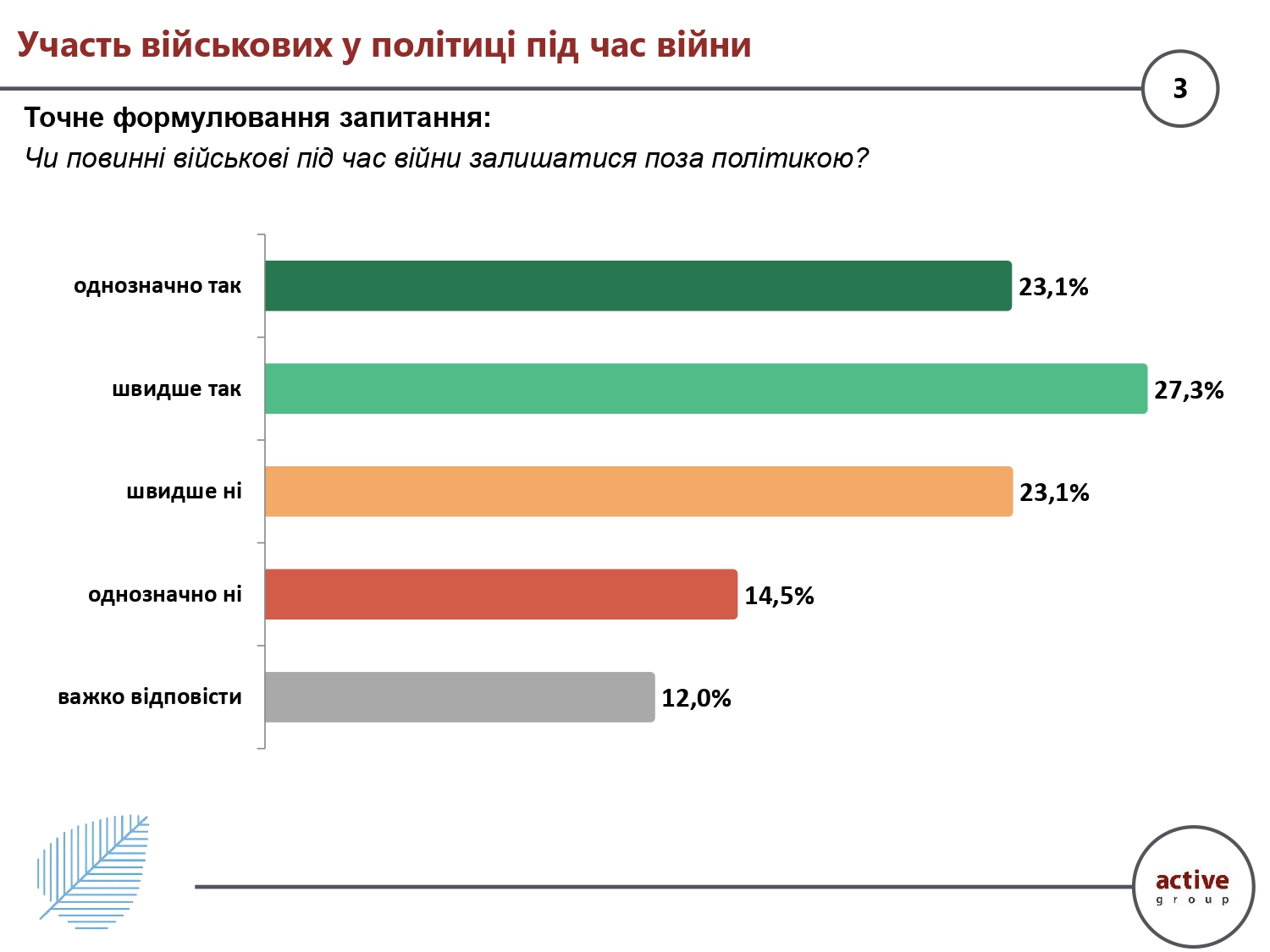 “These results show a clear public demand that the military remain outside of politics until the war ends and concentrate on their key tasks. At the same time, a certain portion of citizens accepts their role in future political processes, but only after Victory,” noted Active Group founder Andriy Yeremenko.