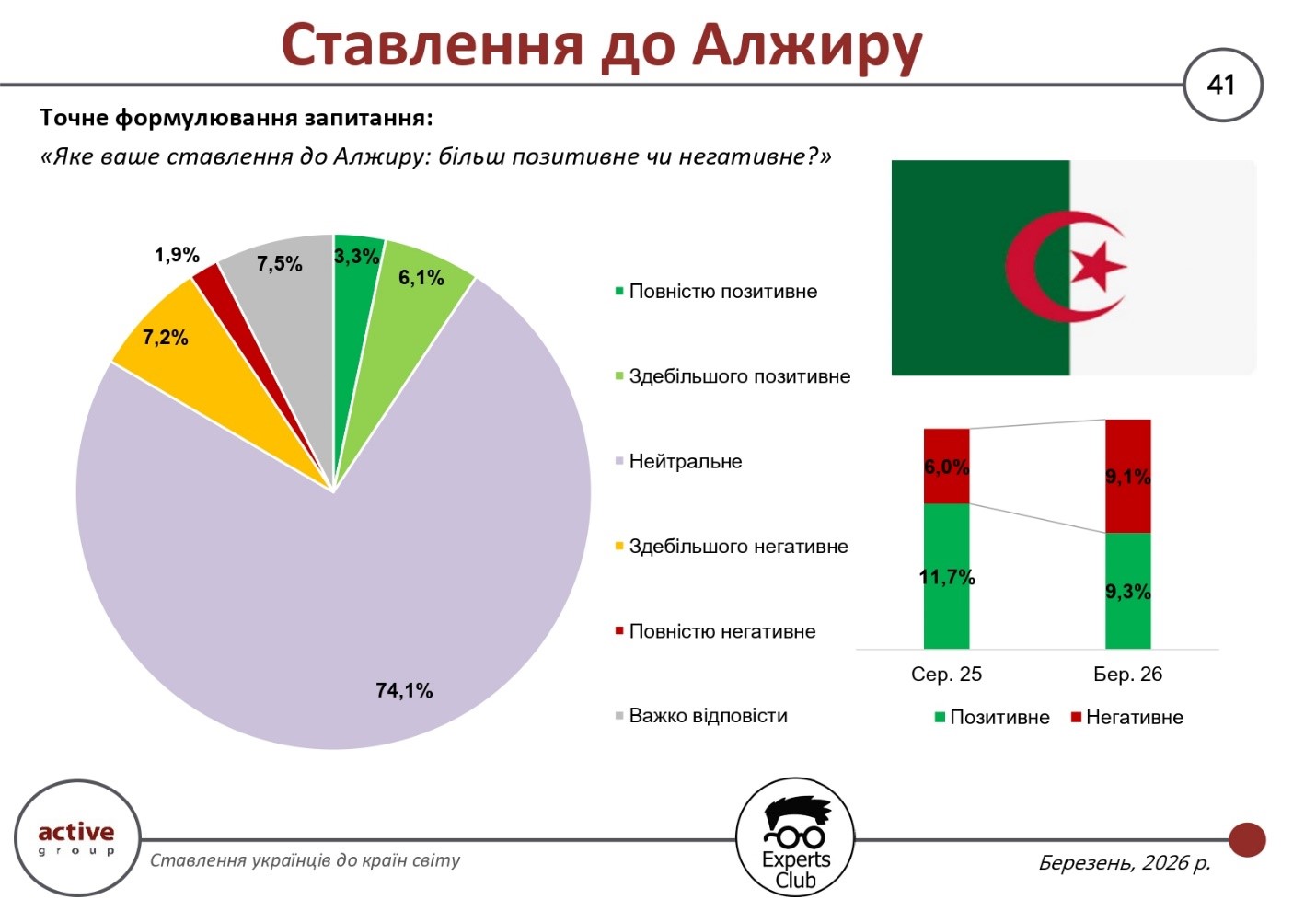 Algeria belongs to a group of countries toward which Ukrainian society demonstrates a limited level of formed opinion. According to the results of a survey conducted in March 2026 by the research company Active Group in collaboration with the information and analytical center Experts Club, 74.1% of respondents rated their attitude toward this country as neutral. This percentage is one of the highest among all countries surveyed and indicates a low level of awareness or personal experience of interaction with Algeria.