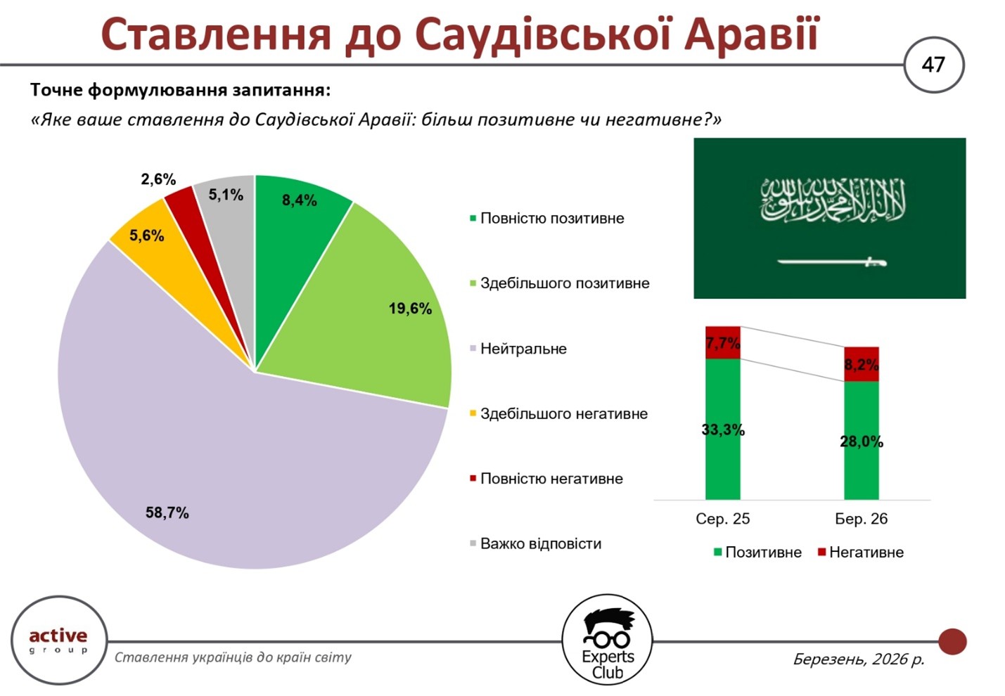 The results of a public opinion poll conducted in March 2026 by the research company Active Group in collaboration with the Experts Club information and analytical center show that Ukrainians’ attitudes toward Saudi Arabia remain largely neutral, though with a slight decline in positive assessments and a gradual increase in negative sentiment. This forms a perception profile characteristic of some Middle Eastern countries—low polarization with a high degree of uncertainty.