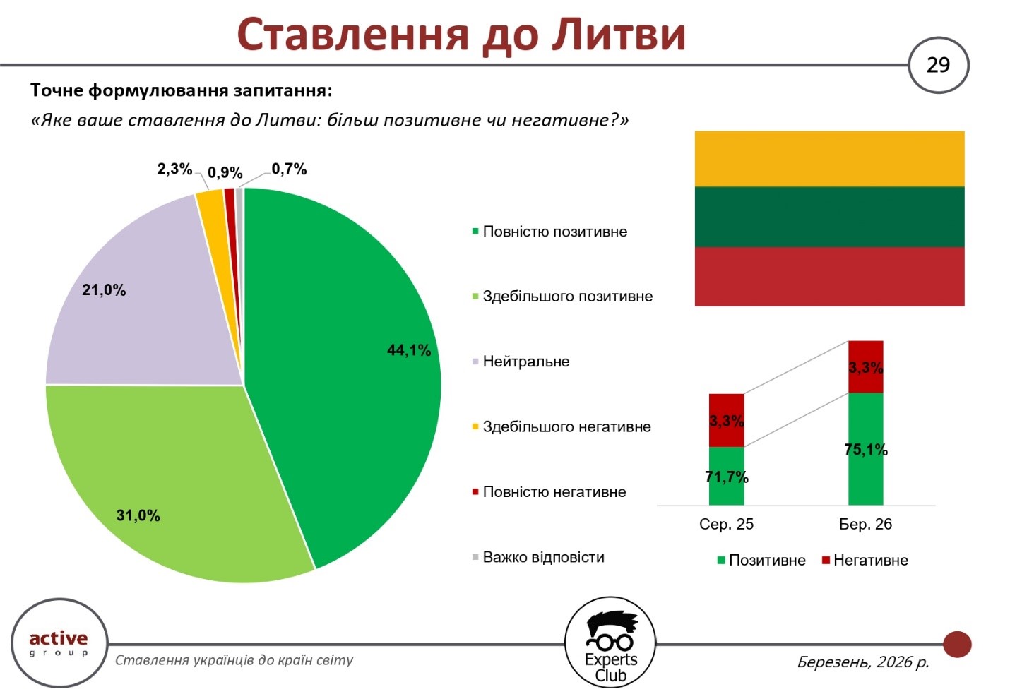 Ukrainians’ attitudes toward Lithuania remain among the most stable and positive of all countries covered by the sociological survey conducted in March 2026 by the research company Active Group in collaboration with the Experts Club information and analytical center. The share of positive assessments rose to 75.1% compared to 71.7% in August 2025, indicating a further strengthening of this country’s positive image in Ukrainian society. At the same time, the level of negative attitudes remained unchanged at 3.3%.