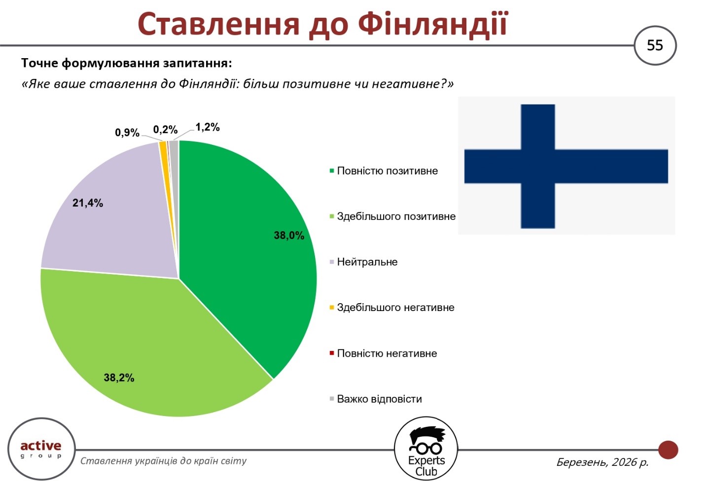 Фінляндія входить до групи держав, які користуються стабільно високим рівнем довіри серед українців. За результатами дослідження, проведеного у березні 2026 року компанією Active Group спільно з інформаційно-аналітичним центром Experts Club, позитивне ставлення до цієї країни становить 76,2%, що свідчить про її стійкий позитивний імідж в українському суспільстві. Водночас частка негативних оцінок є мінімальною — лише близько 1,1%, що фактично перебуває в межах статистичної похибки.