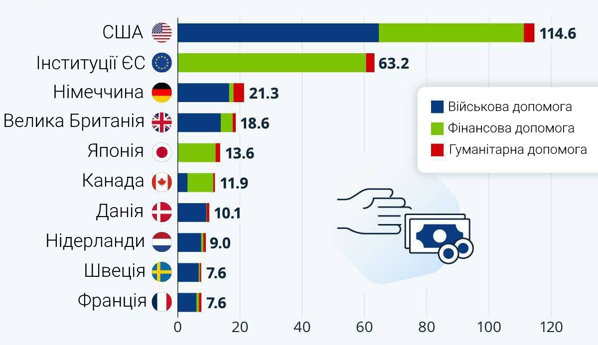 Географічна структура міжнародної допомоги Україні у 2022-2025 роках, млрд євро