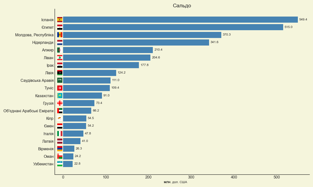 Географічна структура зовнішньої торгівлі України (позитивне сальдо) січні-травні 2025 року, млн. Долл США