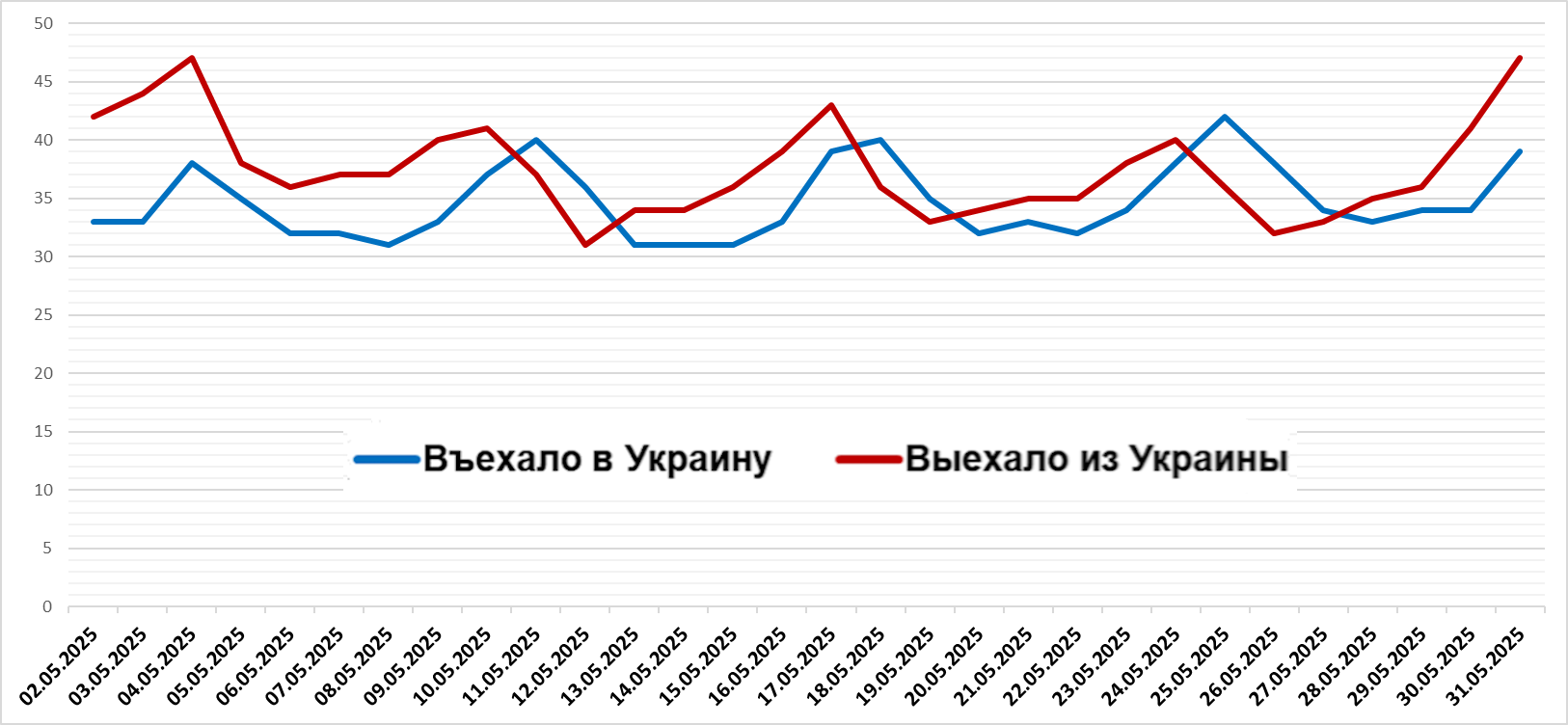 Пасажиропоток через западную границу украины в мае 2025 года, тыс. (графически)