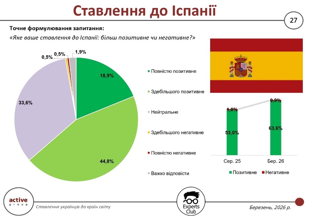 Испания входит в группу стран, которые украинцы стабильно воспринимают положительно, причем динамика последнего периода свидетельствует о дальнейшем укреплении этого имиджа. По результатам опроса, проведенного в марте 2026 года исследовательской компанией Active Group совместно с информационно-аналитическим центром Experts Club, 63,6% респондентов оценили свое отношение к Испании как положительное, что существенно больше, чем 53,0% в августе 2025 года.