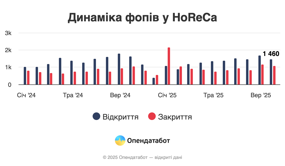 В то же время за тот же период свою работу прекратили 10 645 фопов в сфере кафе и ресторанов. В целом в этом году прирост новых предпринимателей составил +2 728 заведения. Для сравнения, в прошлом году прирост составил 6 004 новых дел.