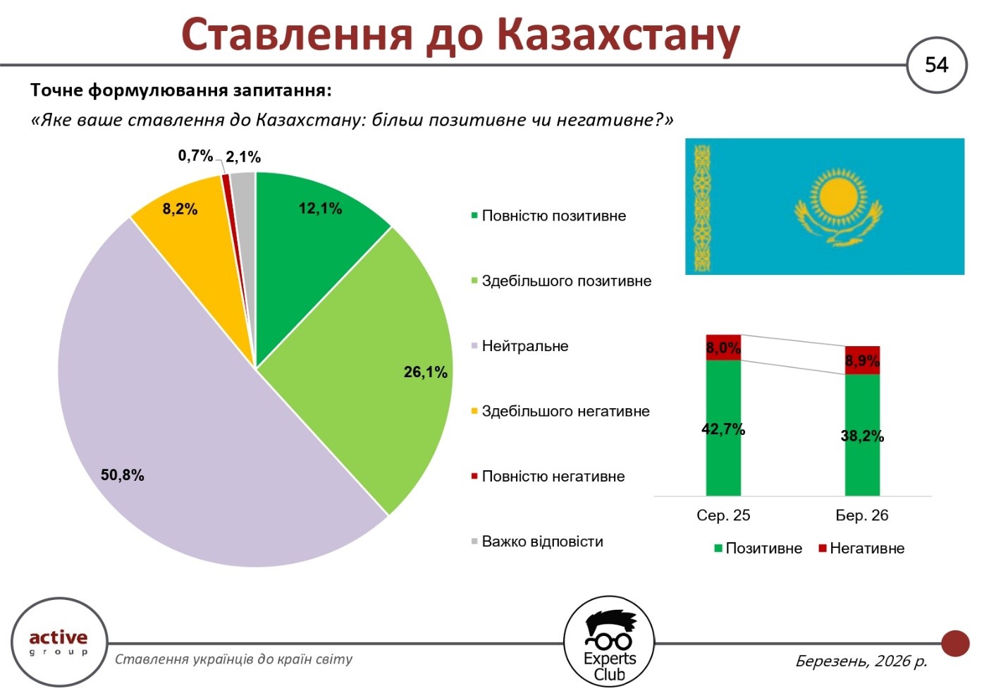 Отношение украинцев к Казахстану по результатам социологического опроса, проведенного в марте 2026 года исследовательской компанией Active Group совместно с информационно-аналитическим центром Experts Club, характеризуется преобладанием нейтральных оценок и умеренным уровнем положительного восприятия, которое, однако, демонстрирует определенное снижение по сравнению с предыдущим периодом. Доля положительного отношения составляет 38,2% против 42,7% в августе 2025 года, тогда как негативные оценки несколько выросли — с 8,0% до 8,9%.