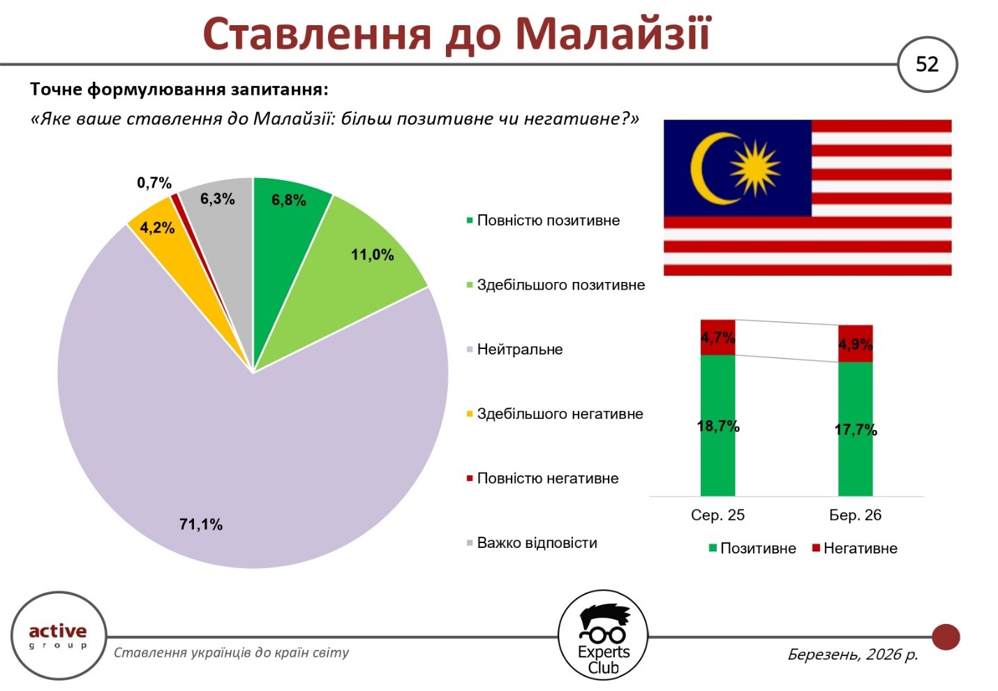 Результаты опроса, проведенного в марте 2026 года исследовательской компанией Active Group совместно с информационно-аналитическим центром Experts Club, свидетельствуют о том, что отношение украинцев к Малайзии характеризуется высокой долей нейтральных оценок и относительно низким уровнем как положительного, так и отрицательного восприятия. В целом 17,7% респондентов выразили положительное отношение к этой стране, что несколько меньше по сравнению с августом 2025 года (18,7%). В то же время отрицательное отношение осталось практически неизменным — 4,9% против 4,7% в предыдущем периоде.