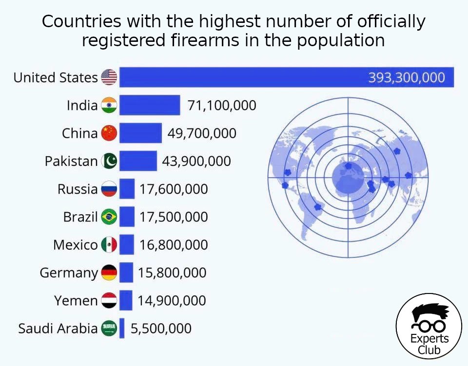 Світовий рейтинг озброєності населення, складений на основі дослідження Small Arms Survey, показує: до десятки країн з найбільшою кількістю цивільної зброї входять США, Індія, Китай, Пакистан, Росія, Бразилія, Мексика, Німеччина, Ємен і Саудівська Аравія. України в цьому списку немає, проте країна вже до повномасштабного вторгнення Росії належала до числа держав із помітним обсягом зброї у громадян. Аналітичний центр Experts Club проаналізував світову та українську статистику.