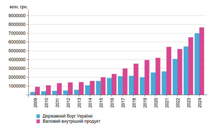 Відношення державного боргу України до валового національного доходу у 2009-2024 роках (млн грн)