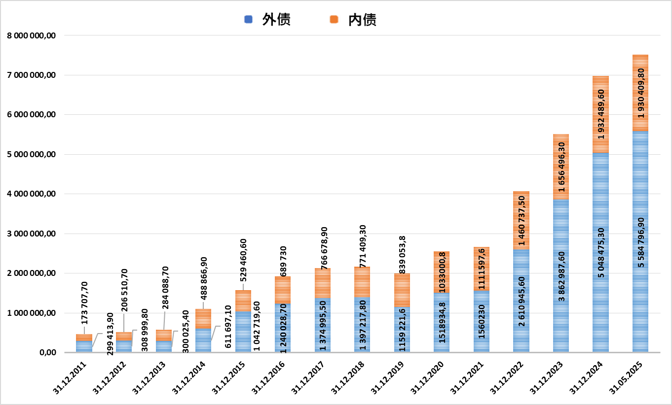 2011 至 2025 年乌克兰国家债务和国家担保债务(百万美元)
